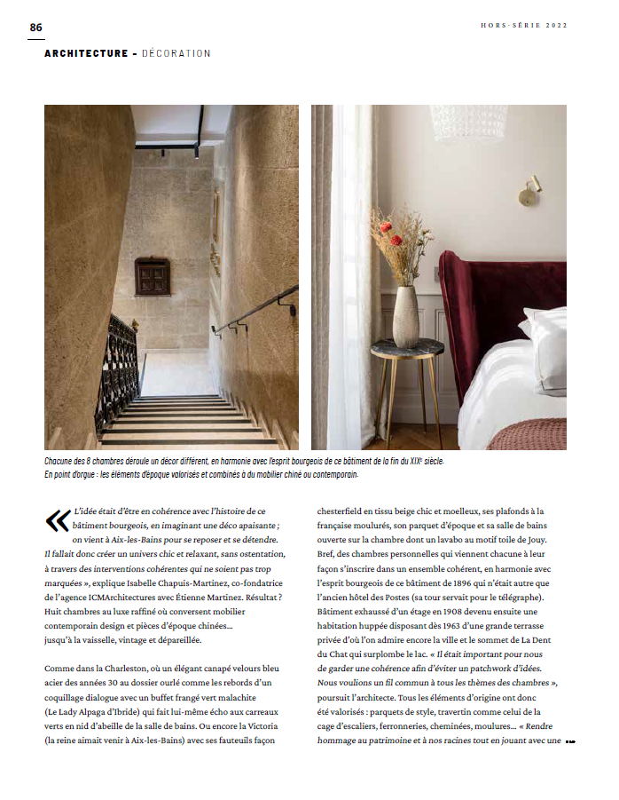 Ambiance soyeuse et feutrée 2 juin 2022 Magazine, Presse > voir l’article au format PDF Partager : Article plus ancien Le Sierroz sort de sa torpeur Article plus récent Parcours architecturés en Savoie
