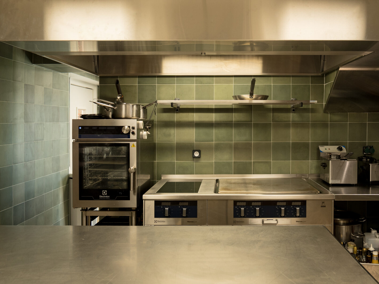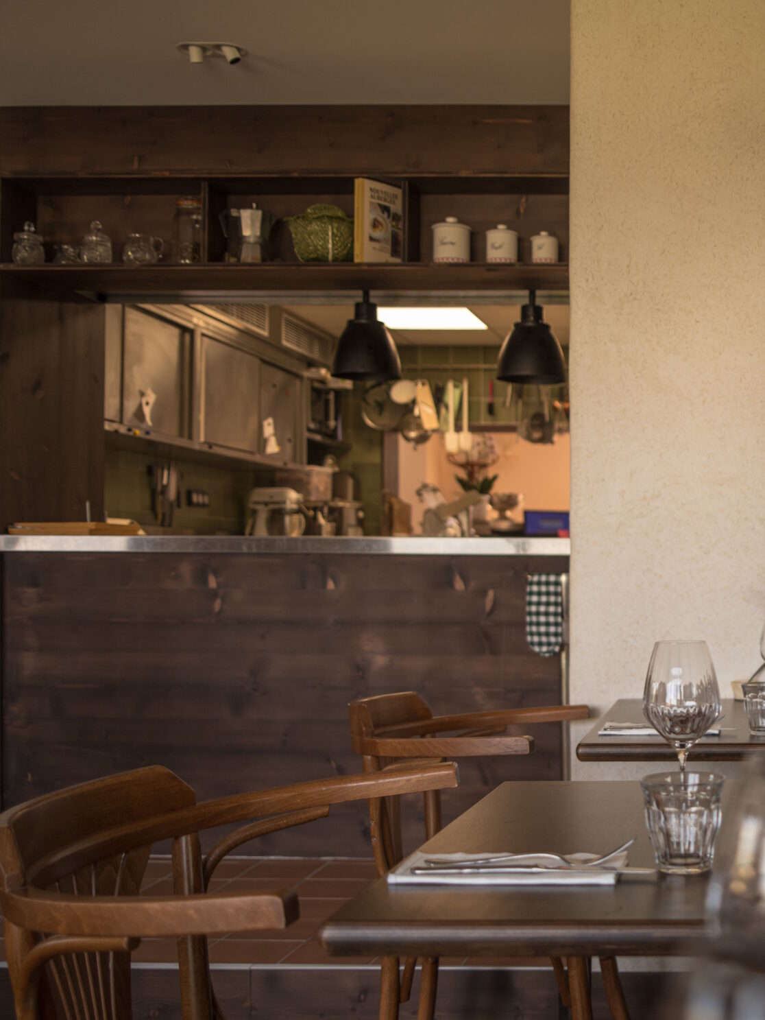 La première action de projet consiste à assainir et consolider le bâtiment, puis à lui redonner une unité graphique. Sur le pignon d’accès au village, une fresque-signalétique anime la façade et rend hommage à ces peintures populaires effacées qui ponctuaient nos territoires. À l’intérieur, une redistribution claire organise le restaurant autour de la cuisine, ouverte sur deux côtés.