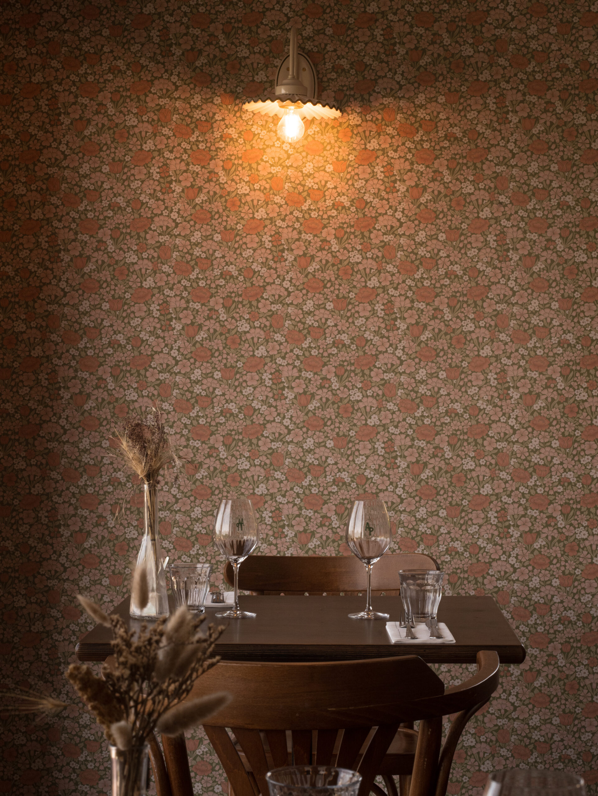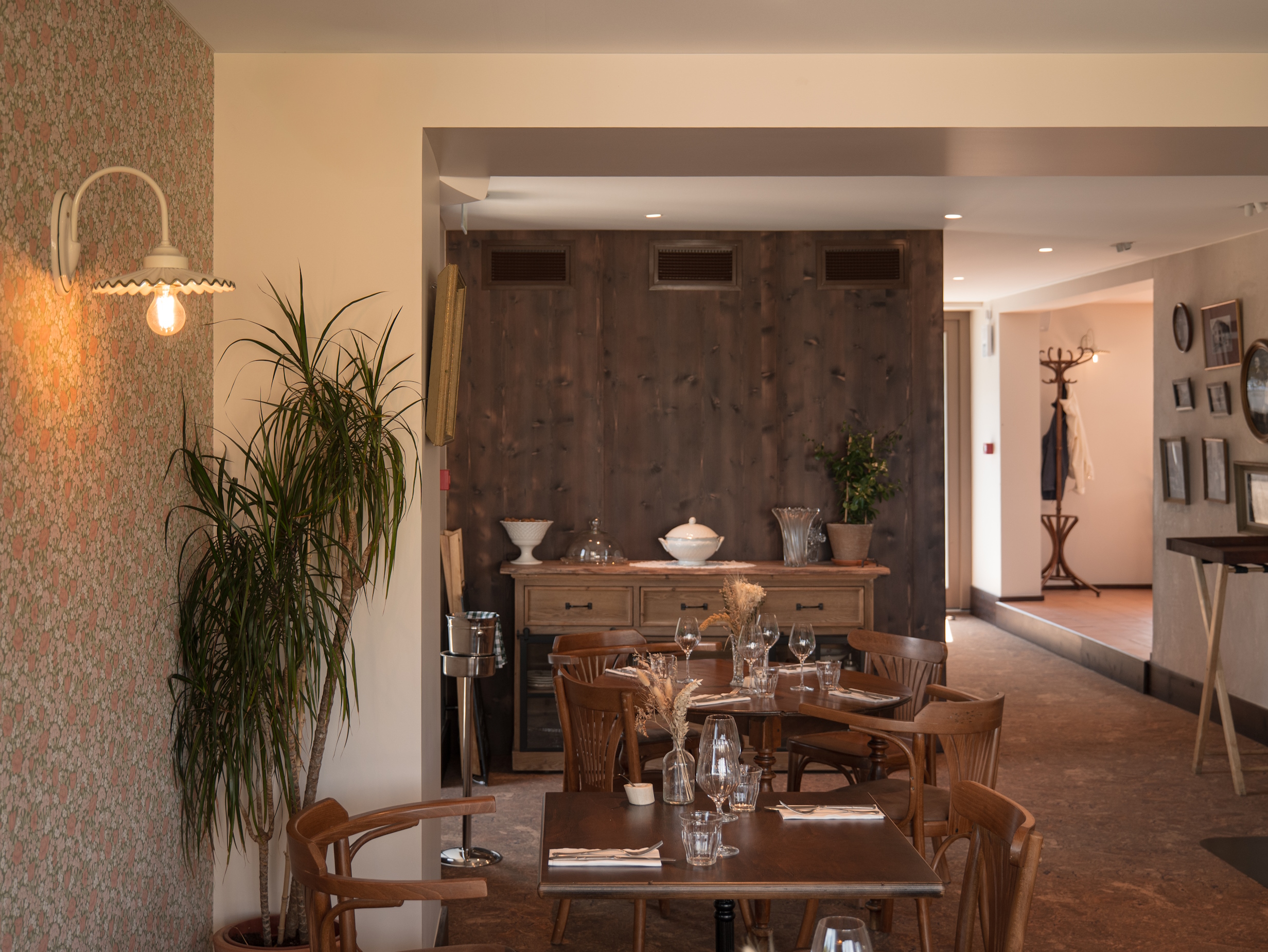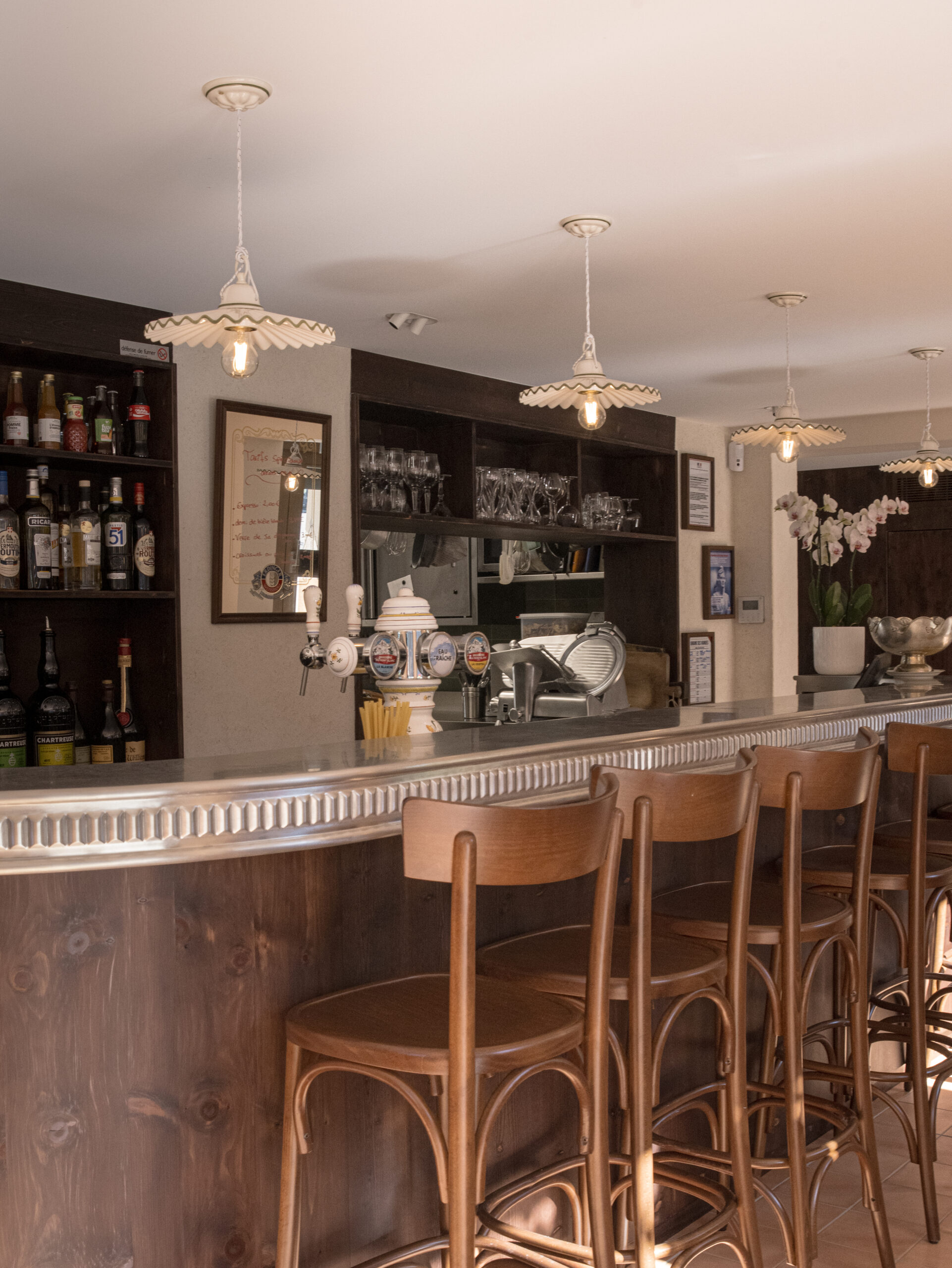 Le dessin et les matériaux expriment le double mouvement du projet : sophistication et rusticité, contemporain et traditionnel. Le zinc couvre le monolithe de bois du bar. L’enduit chaux-chanvre et la terre cuite affirment leur naturalité, en dialogue avec la délicatesse désuète de la tapisserie et des luminaires.