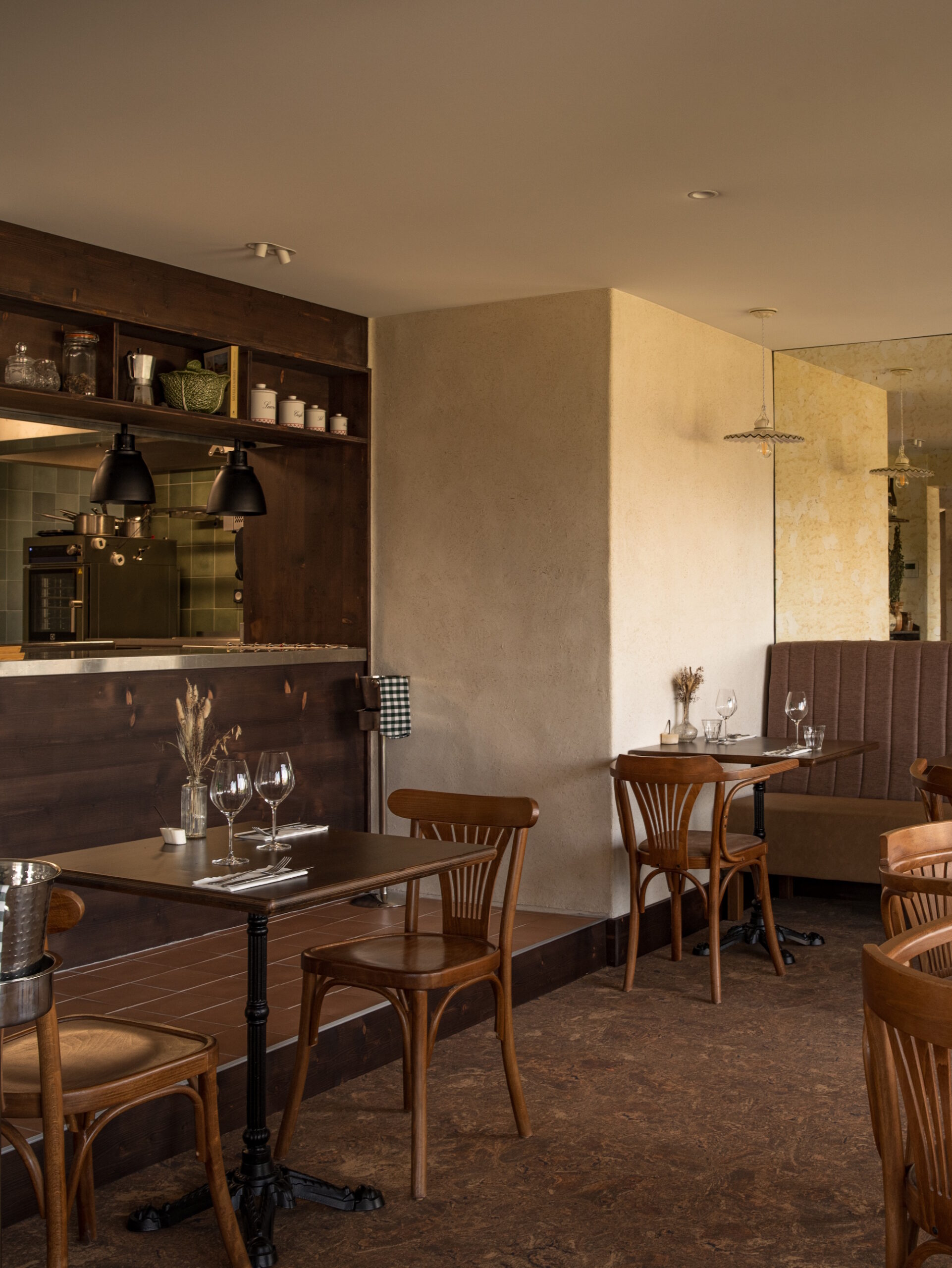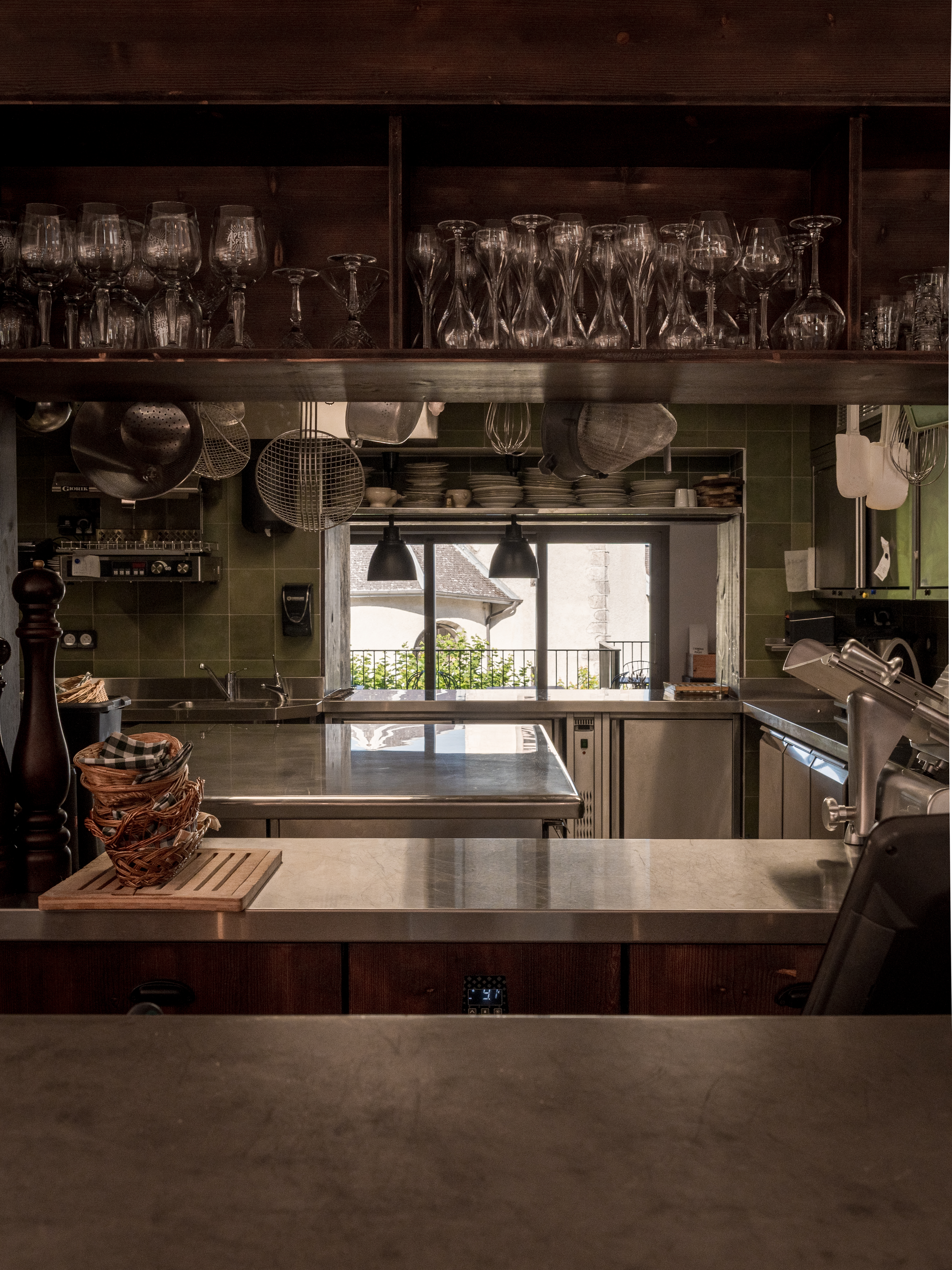 La première action de projet consiste à assainir et consolider le bâtiment, puis à lui redonner une unité graphique. Sur le pignon d’accès au village, une fresque-signalétique anime la façade et rend hommage à ces peintures populaires effacées qui ponctuaient nos territoires. À l’intérieur, une redistribution claire organise le restaurant autour de la cuisine, ouverte sur deux côtés.