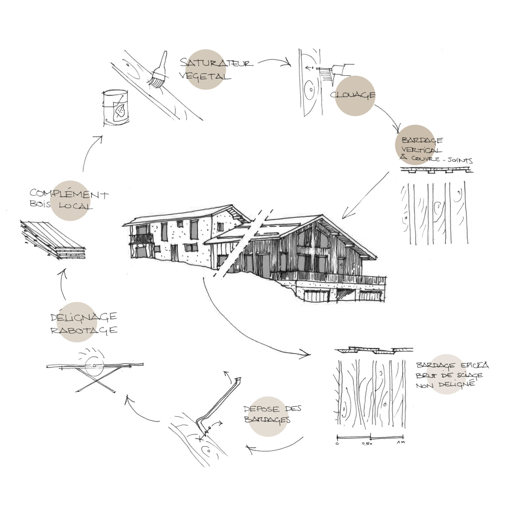 Le chalet Detour à Méribel illustre un engagement fort en matière de réhabilitation éco-responsable en proposant le réemploi du bardage extérieur. Cette démarche, au-delà de son esthétique authentique, vise à réduire l’empreinte écologique en limitant la consommation de nouvelles ressources en montagne et en diminuant les déchets de construction. En réutilisant des matériaux existants et en les remettant en œuvre, le projet du chalet Detour s’inscrit dans une logique de développement responsable de la montagne, tout en valorisant l’héritage architectural local.