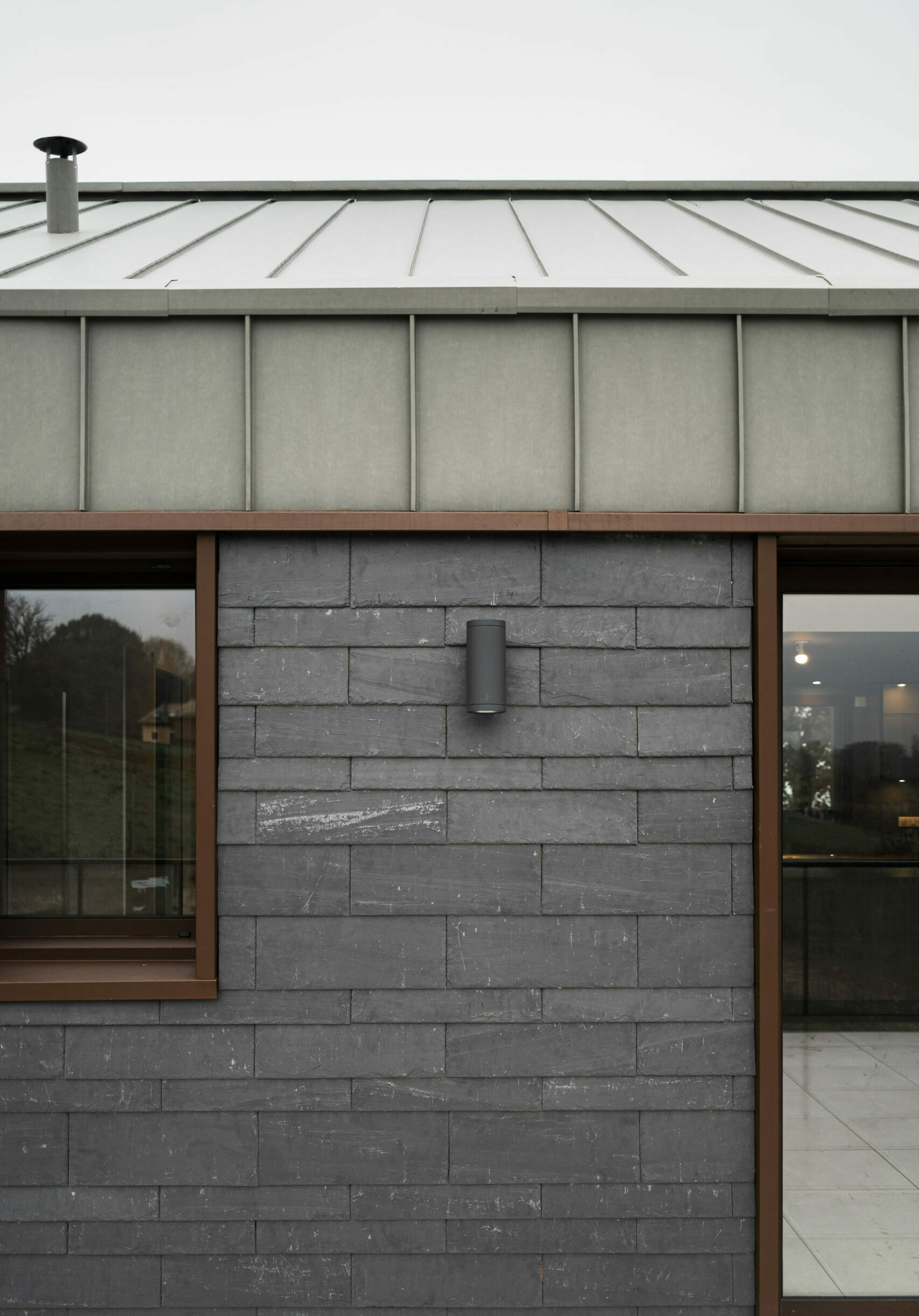 Les pignons en léger renfoncement sont autant de coupes dans la longère qui permettent de cadrer le grand paysage. Pignons et encadrements en ardoise ou ouvertures interrompent et mettent en valeur la peau monolithique en joint debout, vêture de cette maison. Des encadrements autour des menuiseries viennent unifier ces deux niveaux.