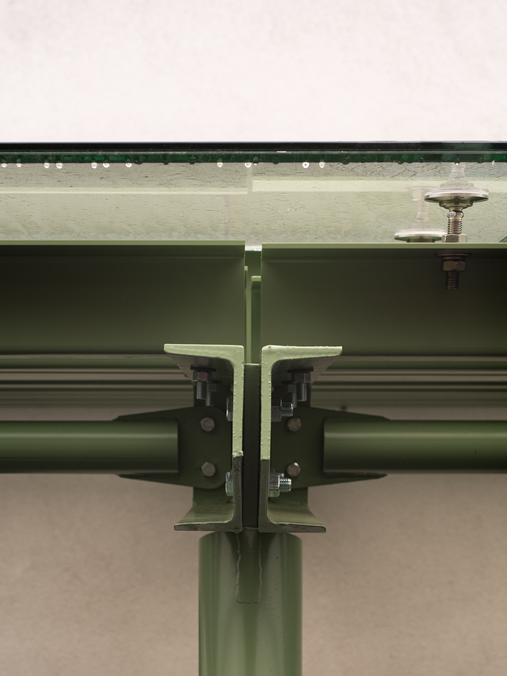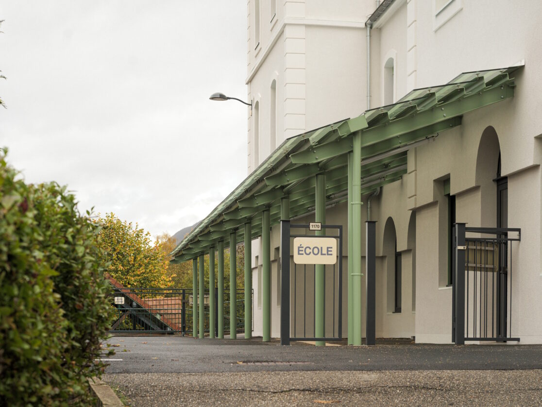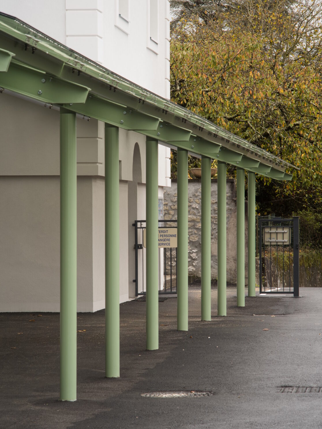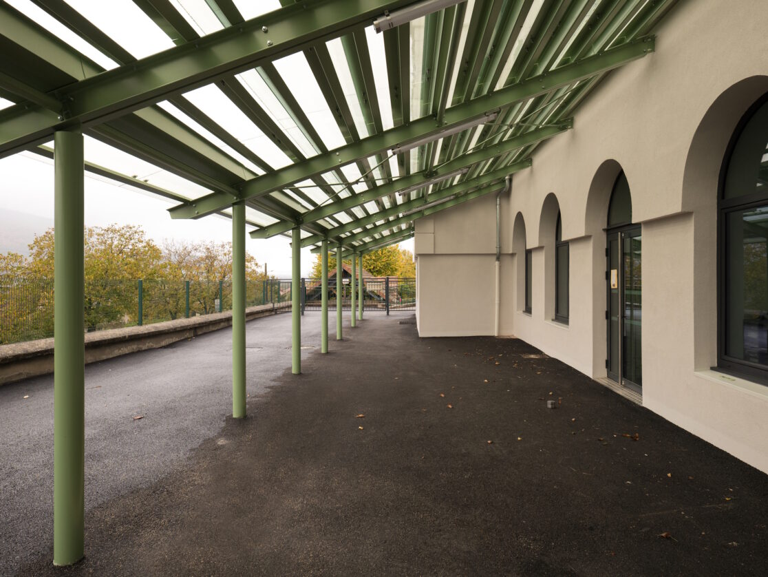 En trait d’union entre les interventions, un préau prolonge les salles de classe sur la cour ouest. Réponse symétrique au fronton de pierre, cette architecture de pergola en verre et métal synthétise les besoins fonctionnels et énergétiques : laisser pénétrer la lumière tout en prévenant les surchauffes, offrir un abri ventilé tout en maintenant la continuité visuelle et spatiale. Une architecture soignée, mesurée, et économe.