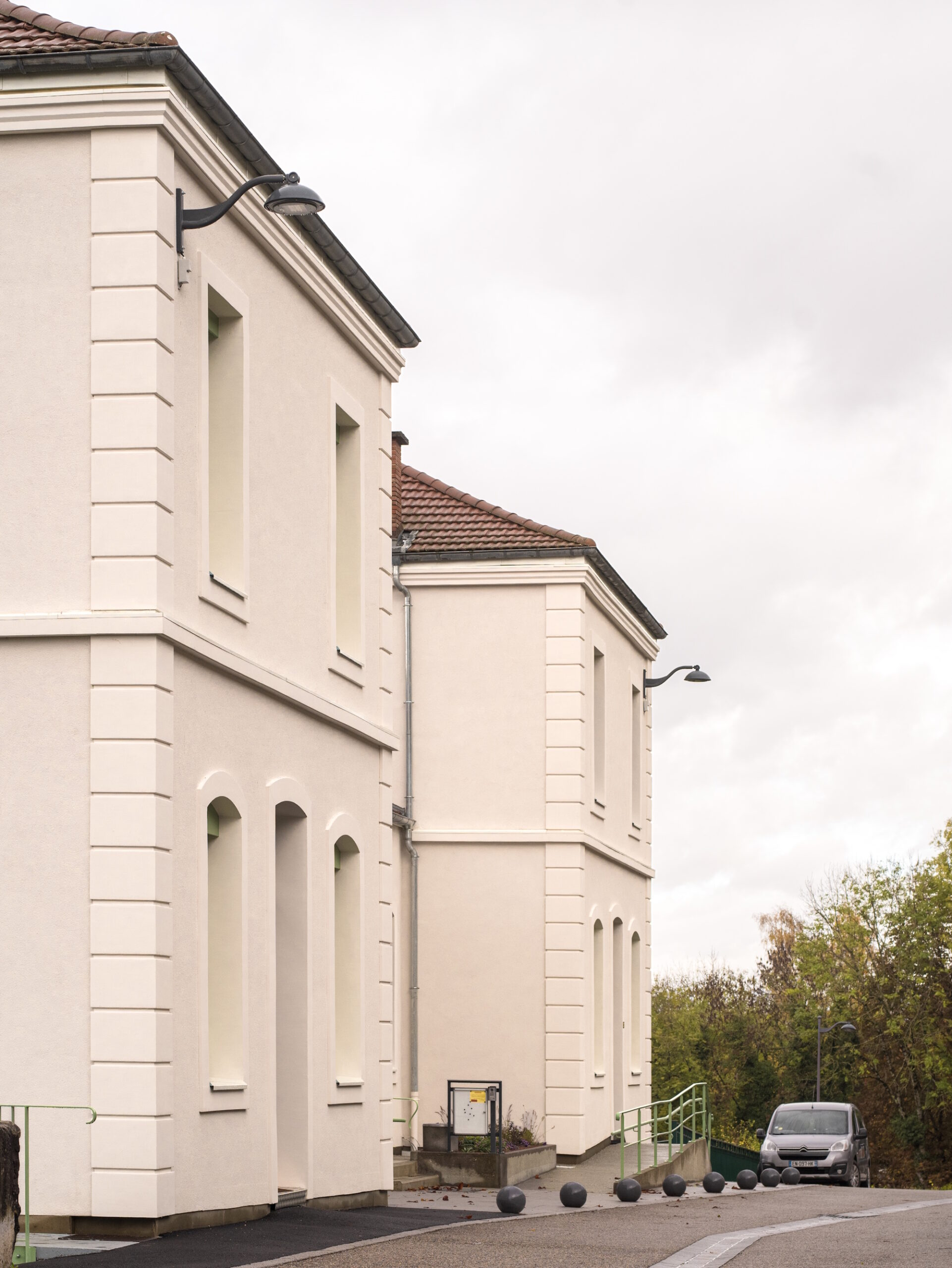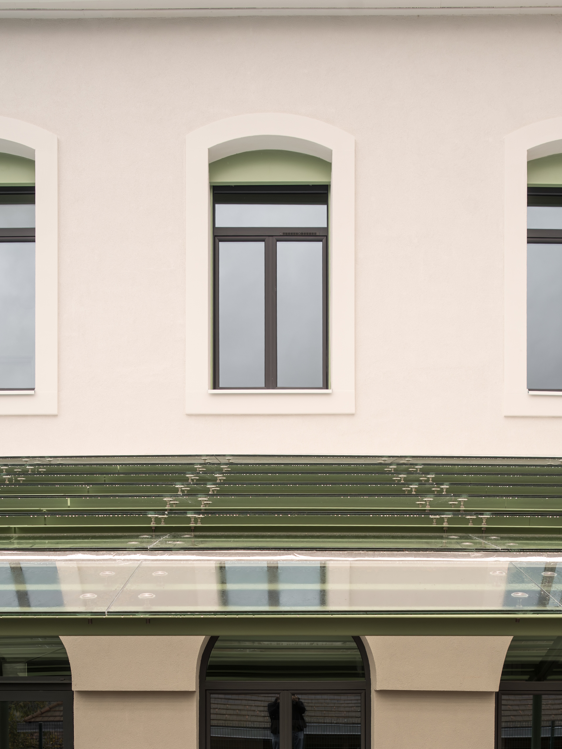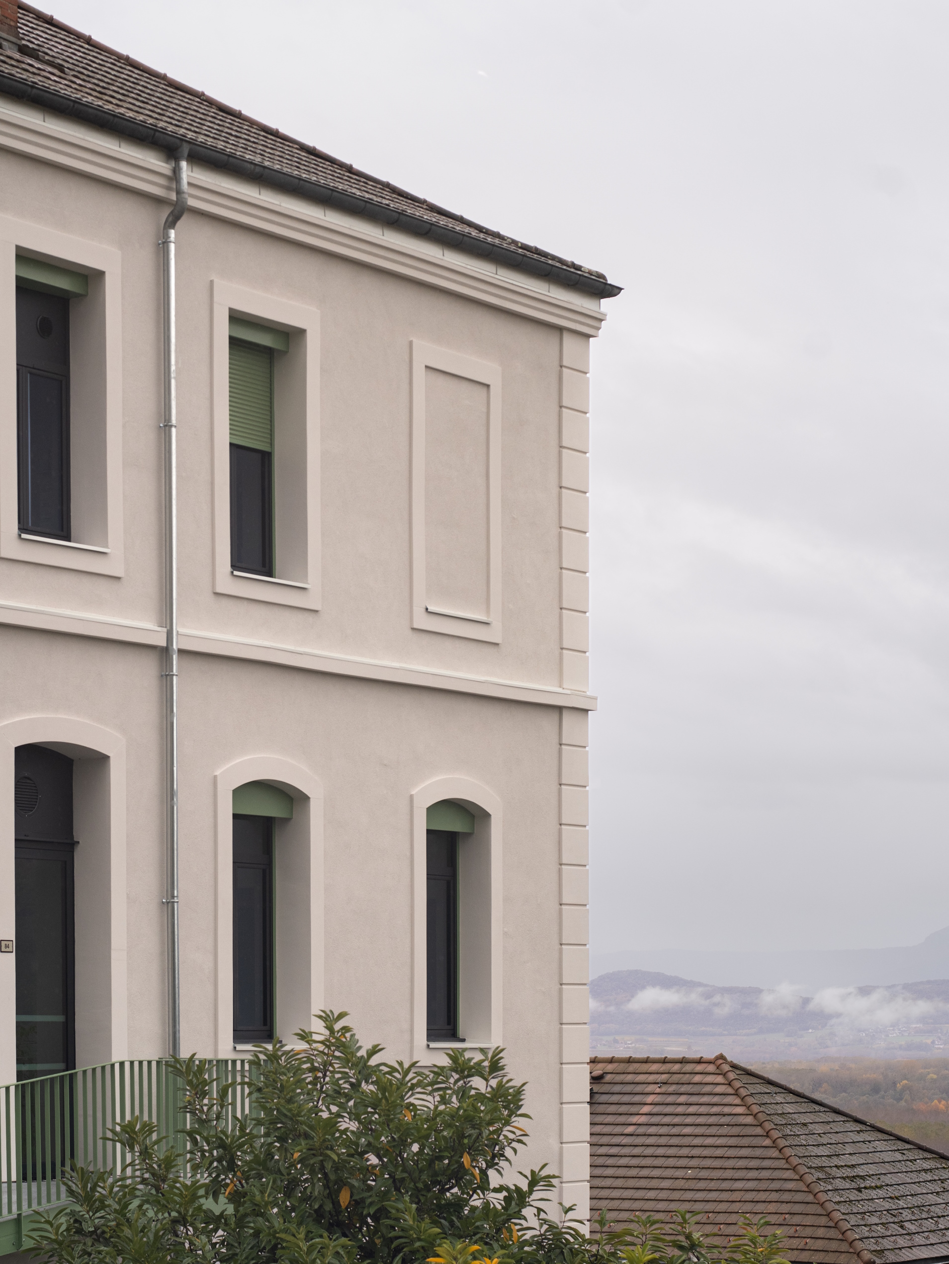 Le remplacement des menuiseries extérieures et la mise en œuvre d’une isolation thermique extérieure sont l’occasion d’épurer les façades. Une écriture sobre et monochrome de l’enduit, met en valeur les jeux d’ombre et de profondeur des modénatures existantes et celles réinterprétées. La teinte historique verte pâle est déclinée, multipliée sur tous les équipements, affirmant la présence contemporaine de ces interventions. Le fronton en pierre de taille, héritage du statut du bâtiment dans son territoire, est restauré, et mis en couleur par une artiste peintre. À l’intérieur, la rénovation des systèmes de ventilation, le relampage et la mise en place d’un chauffage géothermique accompagnent la remise en peinture et améliorent durablement le confort d’usage.