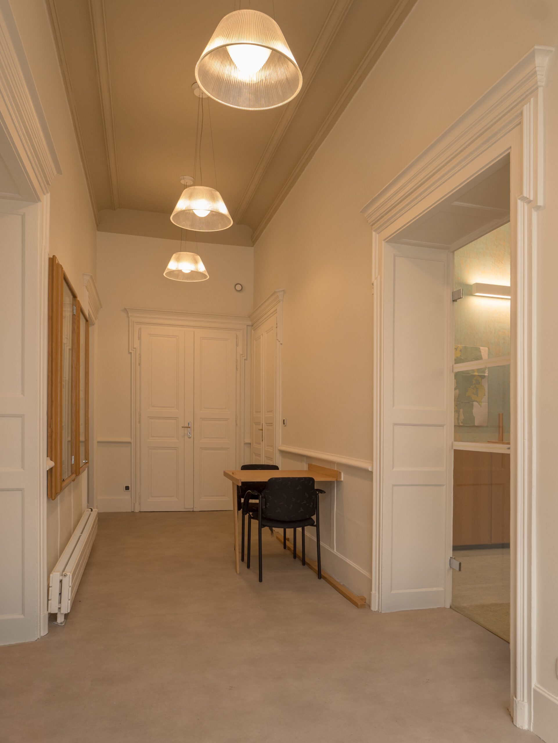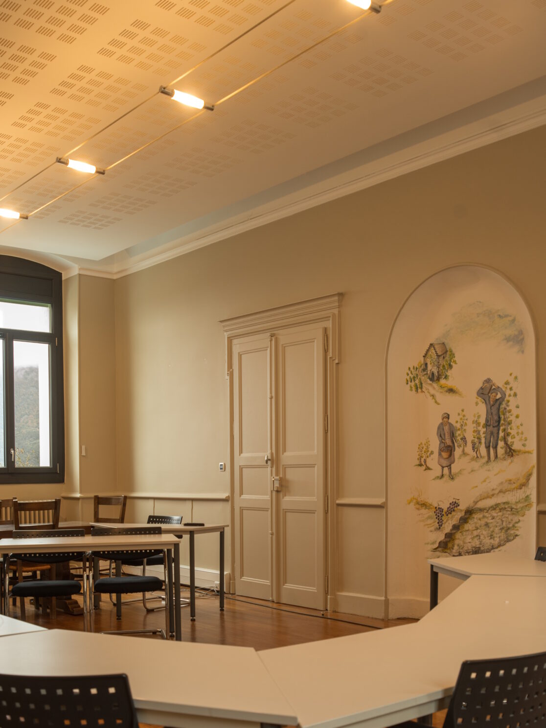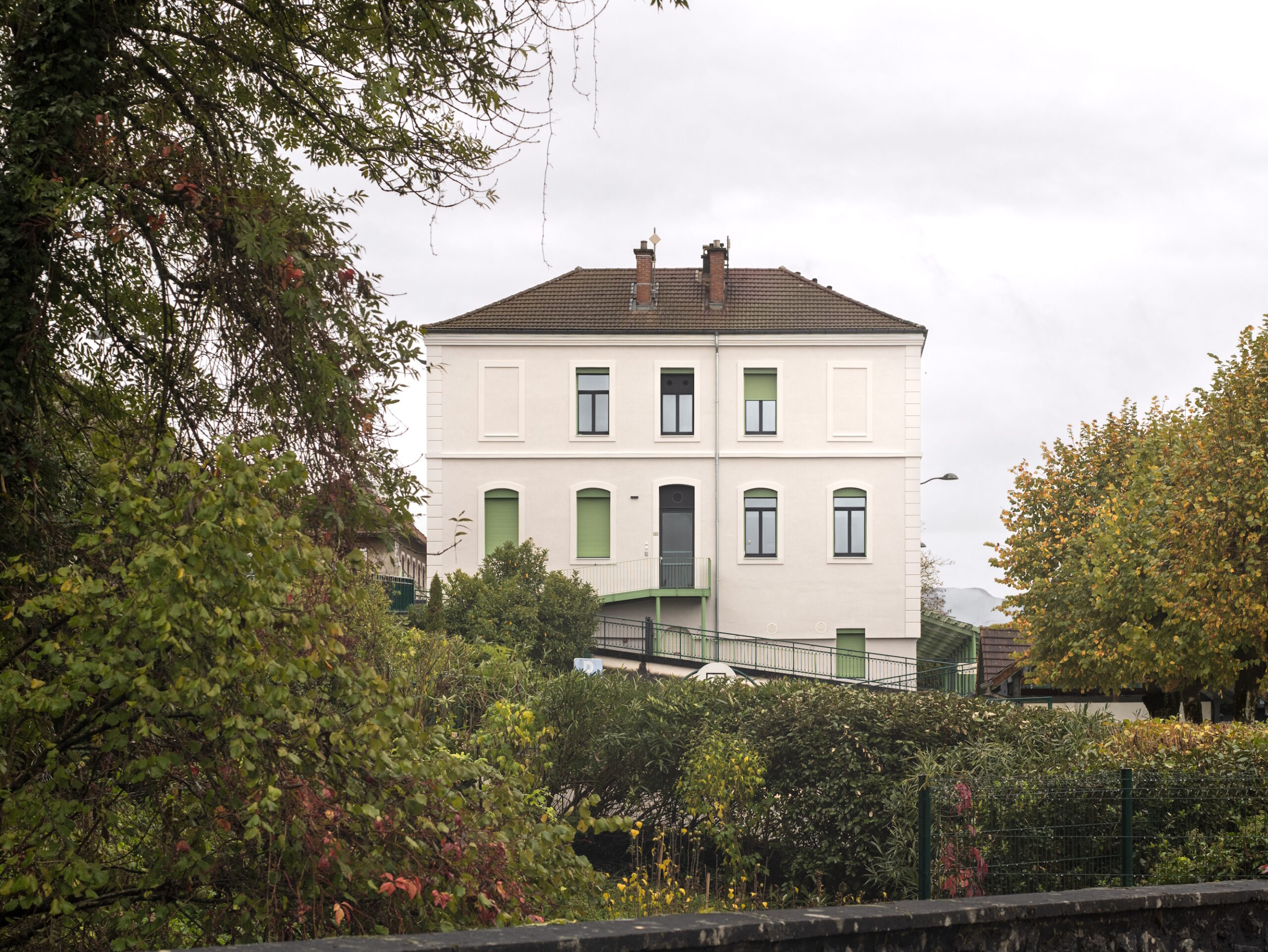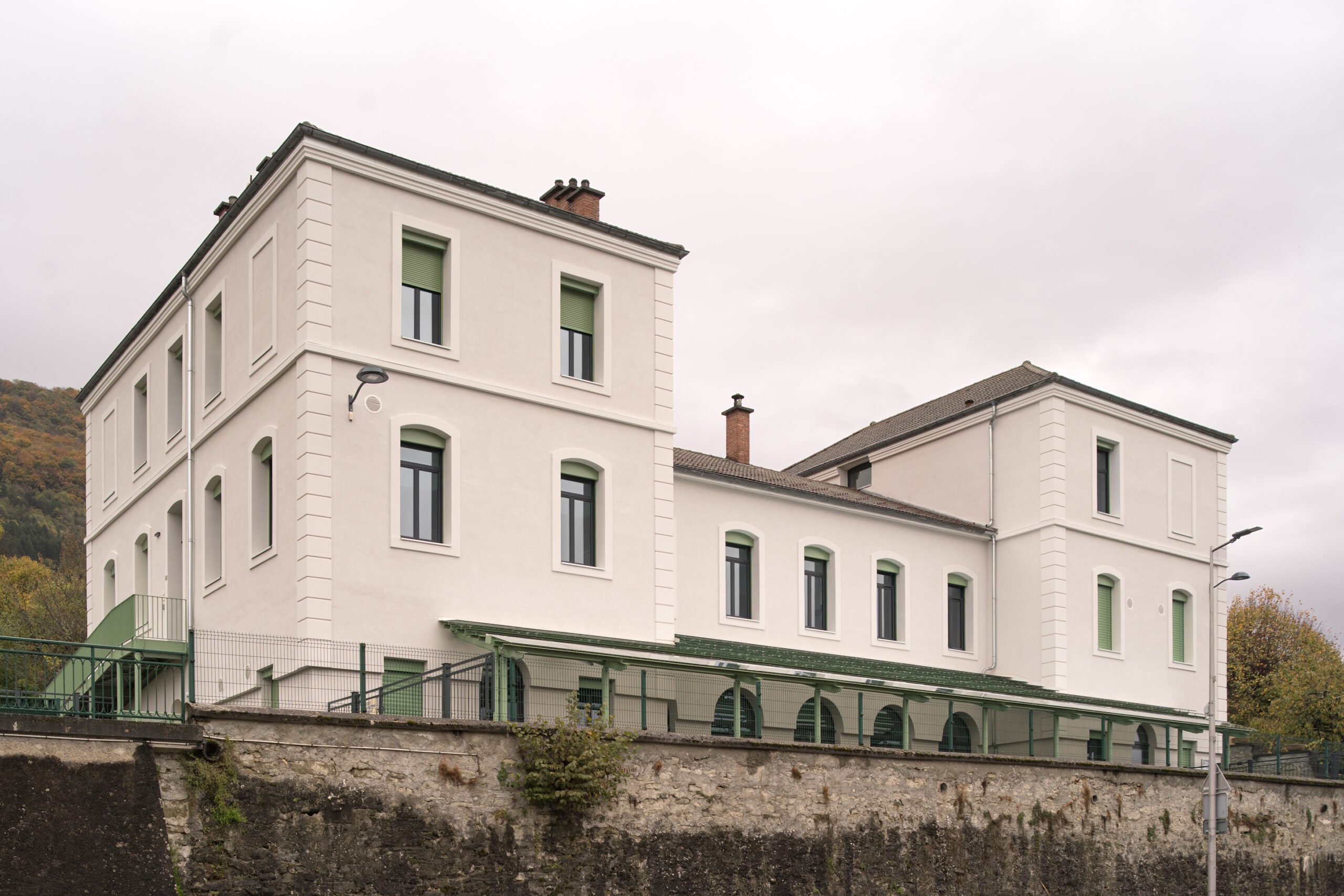 Le remplacement des menuiseries extérieures et la mise en œuvre d’une isolation thermique extérieure sont l’occasion d’épurer les façades. Une écriture sobre et monochrome de l’enduit, met en valeur les jeux d’ombre et de profondeur des modénatures existantes et celles réinterprétées. La teinte historique verte pâle est déclinée, multipliée sur tous les équipements, affirmant la présence contemporaine de ces interventions. Le fronton en pierre de taille, héritage du statut du bâtiment dans son territoire, est restauré, et mis en couleur par une artiste peintre. À l’intérieur, la rénovation des systèmes de ventilation, le relampage et la mise en place d’un chauffage géothermique accompagnent la remise en peinture et améliorent durablement le confort d’usage.