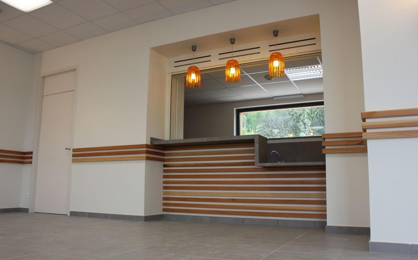 – Extension en ossature bois, hall d’entrée, vestiaire, sanitaires, local technique, tisanerie, salle communale, traitement acoustique et thermique, aménagement des abords.